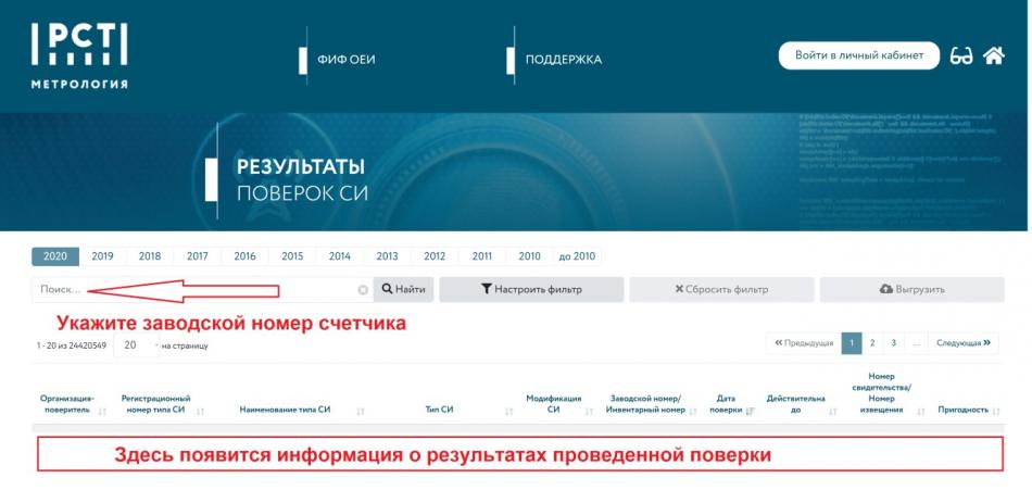 • данные о поверках еще не подгружены, согласно Приказа от 2 июля 2015 г. №1815 срок передачи данных не более 60 календарных дней с даты проведения поверки.